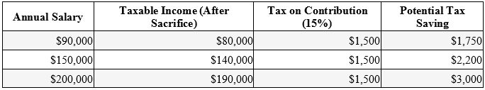 The table below shows how a $10,000 salary sacrifice could work at different income levels, giving you a clear picture of the potential tax savings.