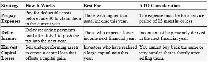A word of caution: this is about smart timing, not tax evasion. The ATO has clear rules around when income is officially earned. Make sure any deferral lines up with your legal and contractual obligations.